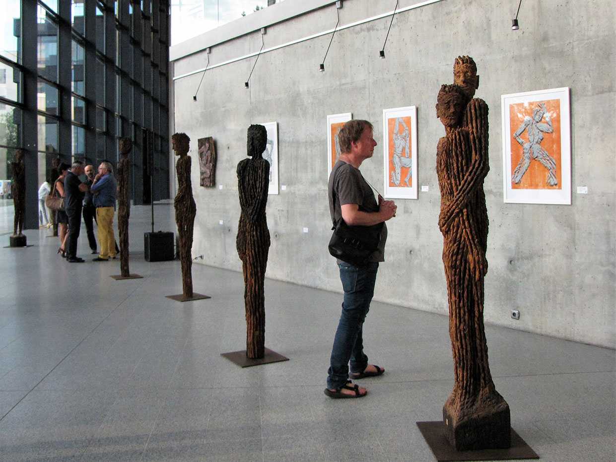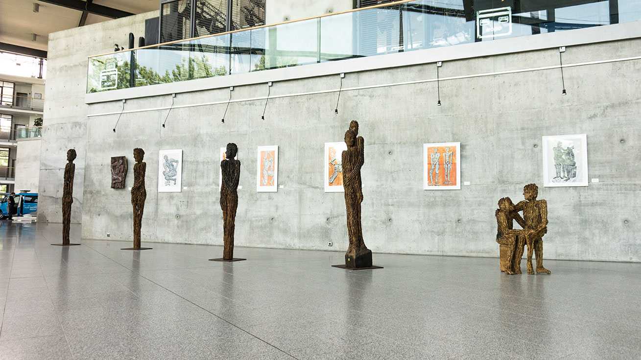 Holzskulpturen und Objekte aus über 400 Jahre altem Eichenholz aus der Elbe gehören zu den Arbeiten des Bildhauers Matthias Trott, die unter dem Titel „einBlicke + anSichten“ im MDR-Landesfunkhaus Sachsen-Anhalt gezeigt werden. Zu sehen sind außerdem Skulpturen aus Marmor sowie Grafiken des Magdeburger Künstlers. Bei seinen Arbeiten mit verschiedenen Medien kommen unterschiedliche Materialien und Verfahren zum Einsatz. So sind auch eine ganze Reihe von Holzschnitten entstanden, in denen Matthias Trott das Thema seiner Holzskulpturen neu interpretiert.
